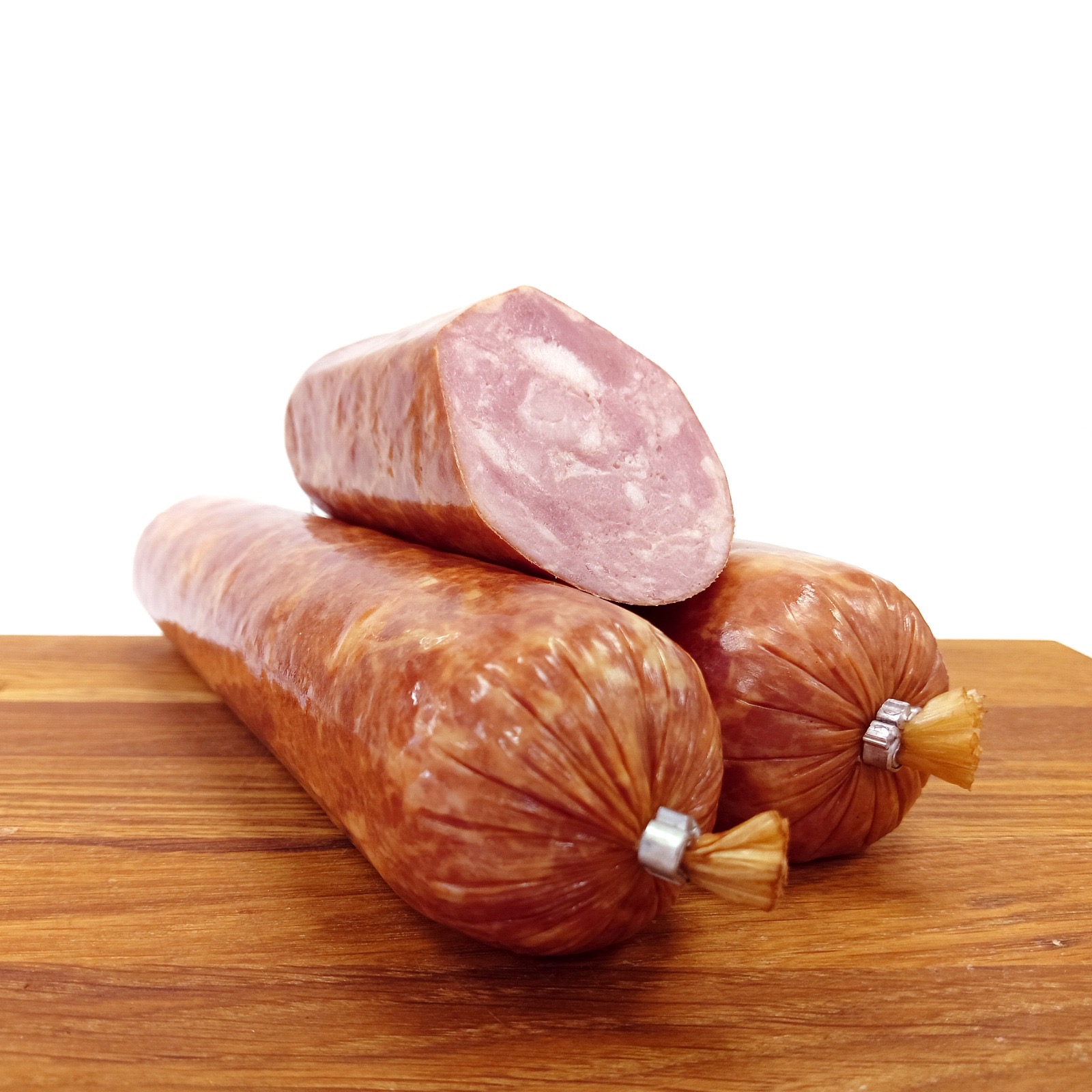Состав: мясо свинины, вода питьевая, смесь посолочно-нитритная, усилитель вкуса и аромата – Е621, стабилизаторы и регуляторы кислотности Е450iii, Е451i, Е452, чеснок, тмин, экстракты пряностей (перец черный, мускатный орех), антиокислитель – Е316, ароматизатор пищевой со вкусом мяса гриль,, загустители – Е401, Е412, Е417, Е466, клетчатка, животный белок, сахара (декстроза, мальтодекстрин), пряности (перец черный, перец белый), гемоглобин, краситель – Е120.